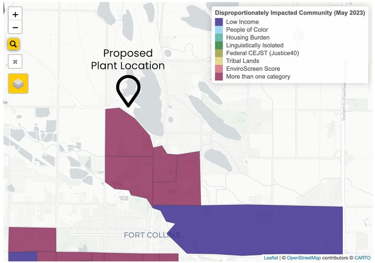 El sector censal al otro lado de la calle del sitio propuesto obtiene una puntuación de 94 sobre 100, siendo el número más alto el peor, en Colorado EnviroScreen del Departamento de Salud Pública y Medio Ambiente de Colorado. Esta puntuación representa la carga medioambiental sobre los residentes de esa zona.